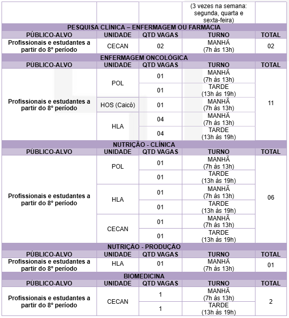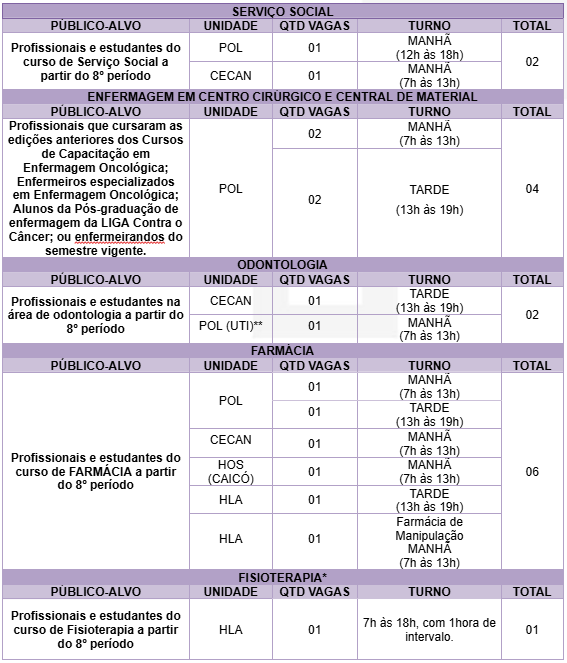 *O turno do módulo prático será definido no ato da matrícula, não podendo ser alterada durante o decorrer do curso, exceto em casos excepcionais, que serão avaliados pela coordenação do IEPI e ocorrerão em quaisquer das unidades da LIGA NORTERIOGRANDENSE CONTRA O CÂNCER (LNRCC), a critério da disponibilidade de vaga de cada setor e turno.